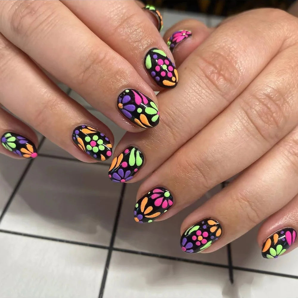 24pcs Leopard Print Brown Nails Art Gilded Pearl Design Almond Fake Nail Tips Flower False Nail for Women Girl Press on Nails